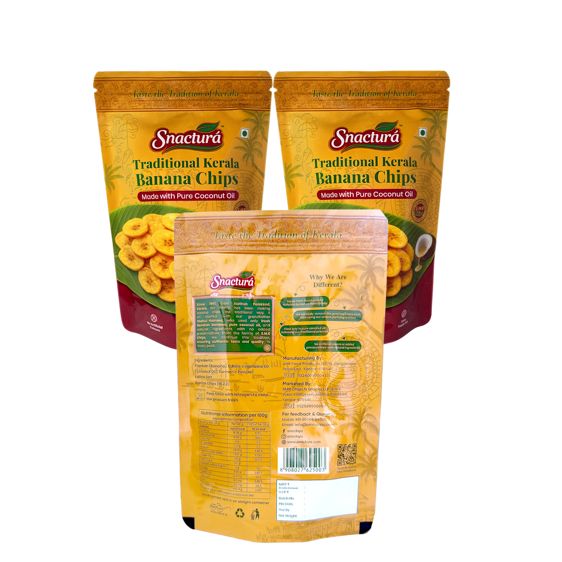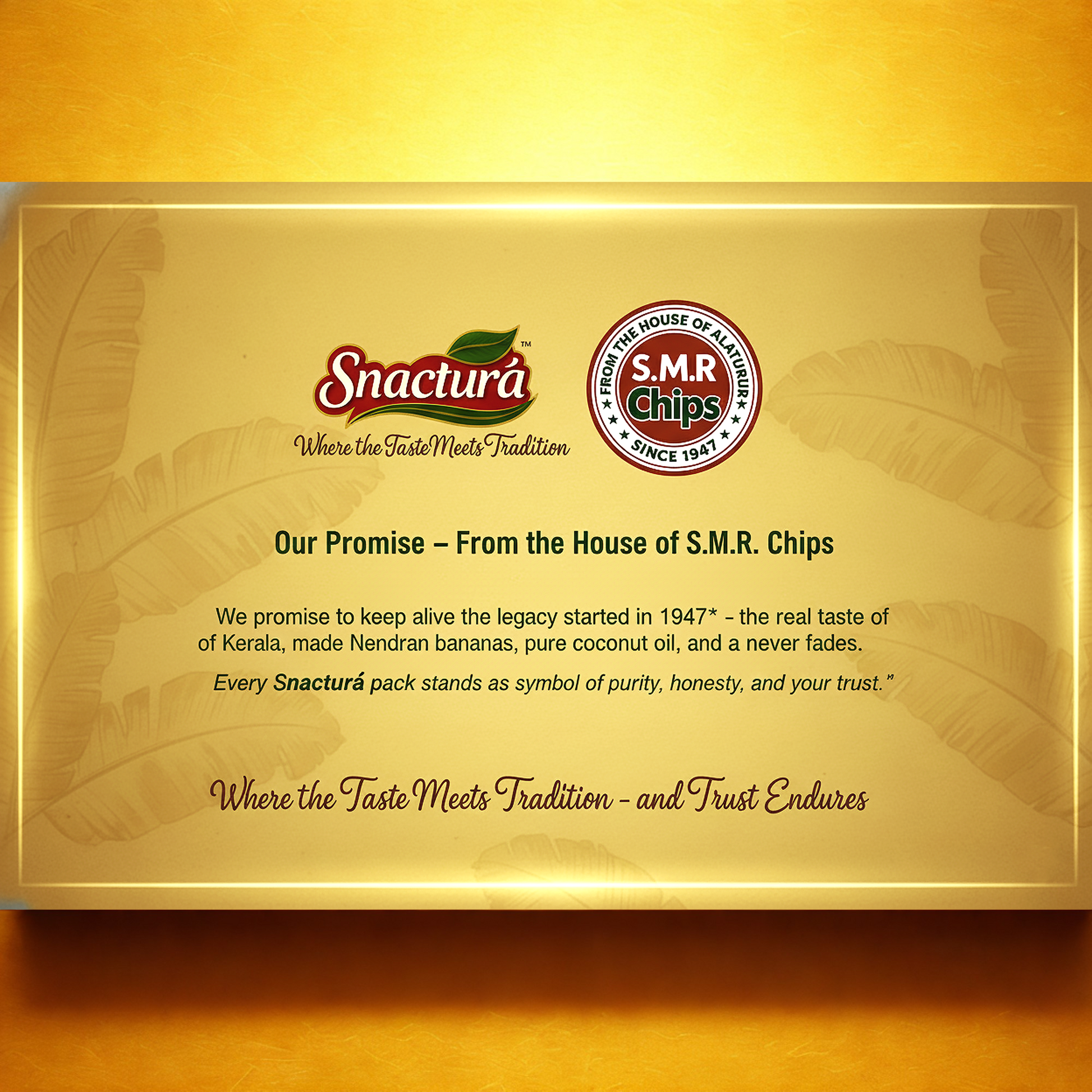 Snacturá brings authentic Kerala banana chips crafted with fresh Nendran bananas, pure coconut oil, and simple natural ingredients. A premium snack brand from the S.M.R Chips family, ensuring trusted quality.